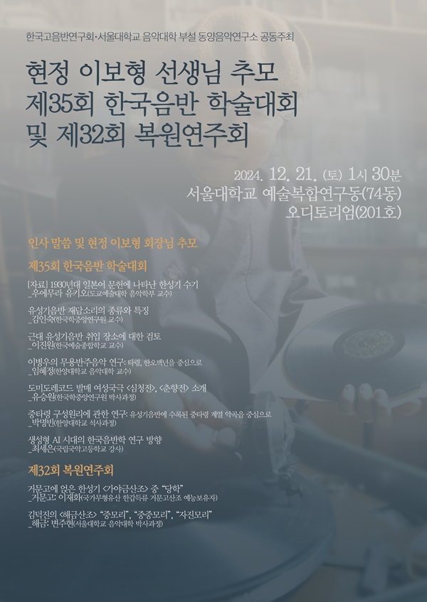 ÇöÁ¤ À̺¸Çü ¼±»ý´Ô Ã߸ð Á¦35ȸ Çѱ¹À½¹ÝÇмú´ëȸ ¹× Á¦32ȸ º¹¿ø¿¬ÁÖȸ(ÁÖÃÖ:Çѱ¹°íÀ½¹Ý¿¬±¸È¸¡¤¼¿ï´ëÇб³ À½¾Ç´ëÇÐ ºÎ¼³ µ¿¾çÀ½¾Ç¿¬±¸¼Ò) ÇöÀå ³¶µ¶ ±Û.